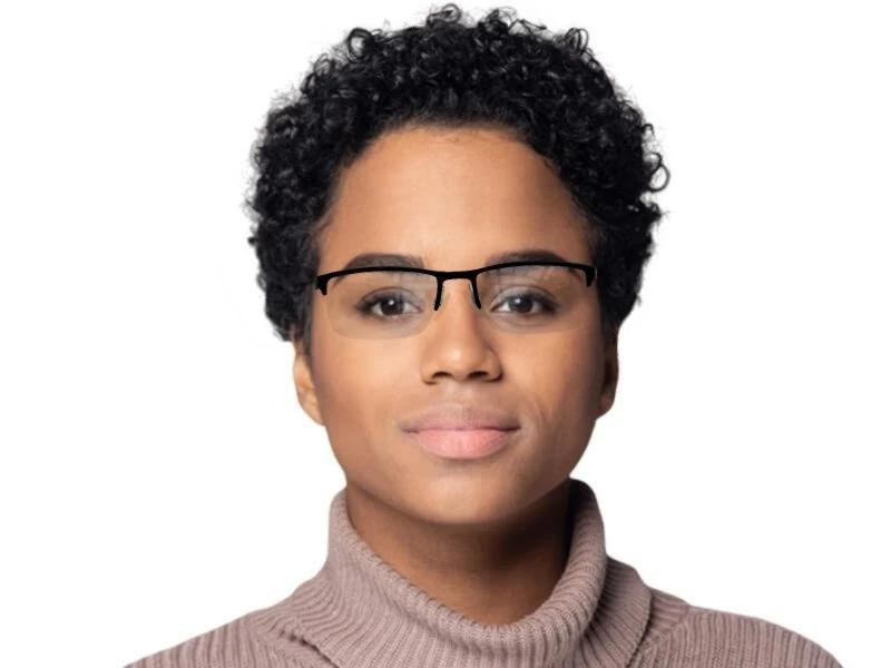 eher runden Gesichtsformen. Die Hauptfarbe des Brillenrahmens ist Schwarz. Er