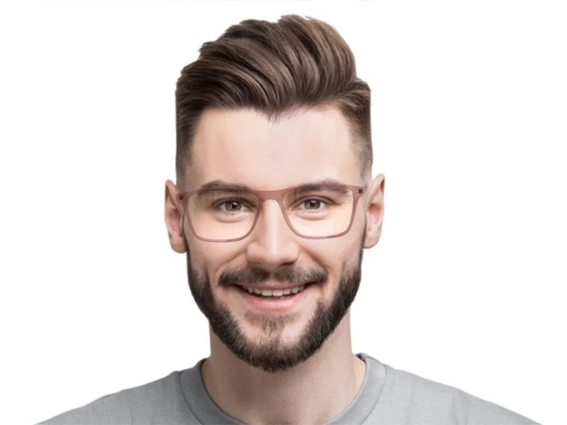 Gesichtsformen. Die Rahmenfarbe ist Violett und passt perfekt zu grünen Augen